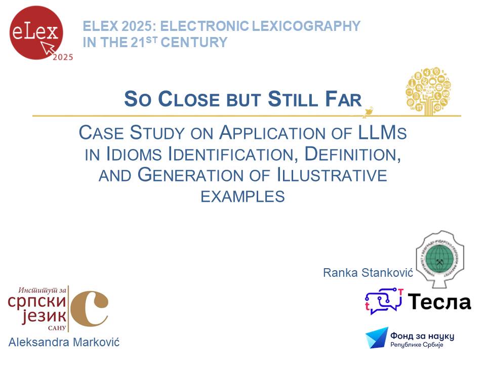 На Бледу, у Словенији, од 18. до 20. новембра 2025. године одржана је конференција посвећена електронској лексикографији – eLex 2025: electronic lexicography in the 21st century: Intelligent Lexicography (https://elex.link/elex202). На конференцији је учествовала др Александра Марковић, виши научни сарадник Института, са излагањем на тему: So Close but Still Far: Case Study on Application of LLMs in Idioms Identification, Definition, and Generation of illustrative examples.